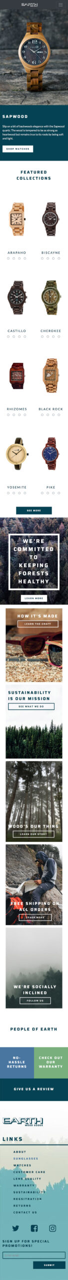 I found a few competitor sites that sell wood watches and sunglasses, but I didn’t like them enough to take much from them. There was a lot of cheesy photoshopping and tacky designs. Instead, I decided to spin the brand like Timex, but in the woods. I paired lifestyle shots with pictures of forests and bold blocks of color with the headlines.