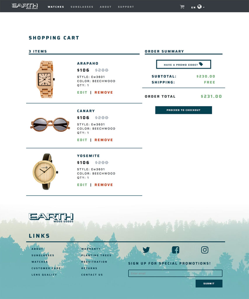 Since the products were made of wood, I took a “back to the roots” approach to the soft rebranding of Earth. Namely, that meant earthy colors inspired by the forest and lots of natural imagery. I found a nice font, Siara, to mimic the existing logo font, and paired it with an unassuming sans serif called Lato. It’s a nice combo that I’ll keep in mind for later.